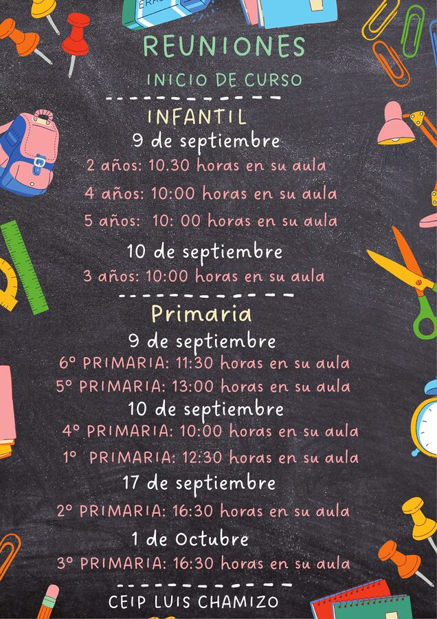 Reuniones iniciales curso 2025/26. Escrito por Miguel Ángel Sánchez Moriano en 5 de septiembre de 2025. Publicado en Portada. Estimadas familias:Adjuntamos los horarios de las reuniones iniciales.